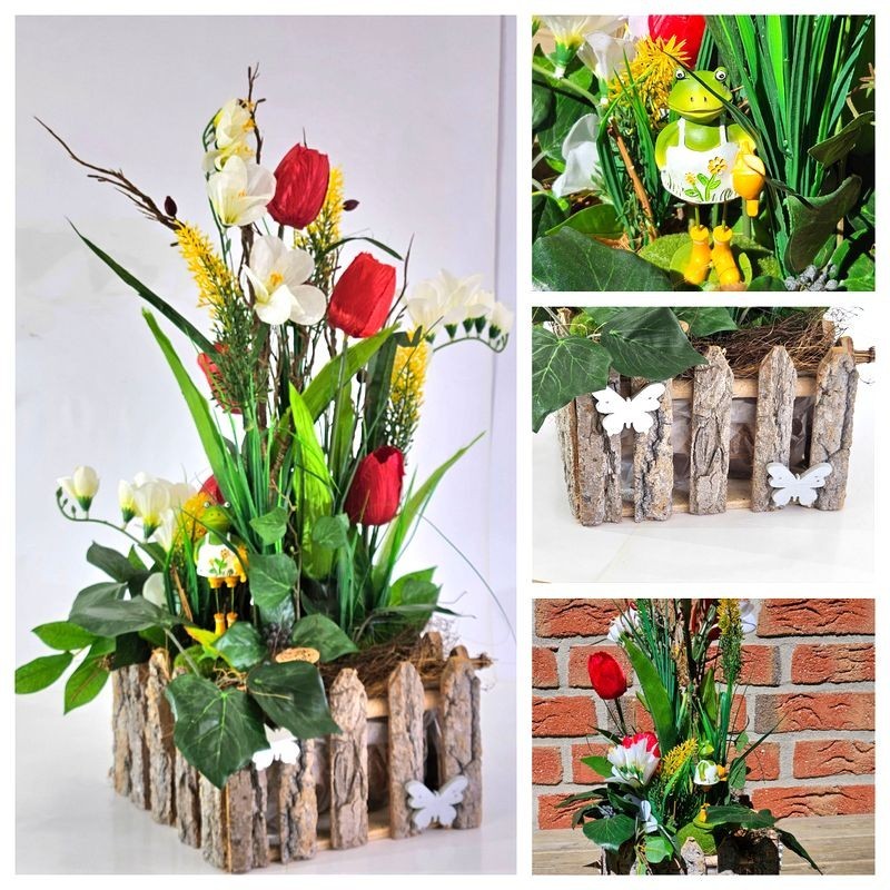 Produktart: künstliches Blumengesteck in Gartenzaun Optik Gefäß