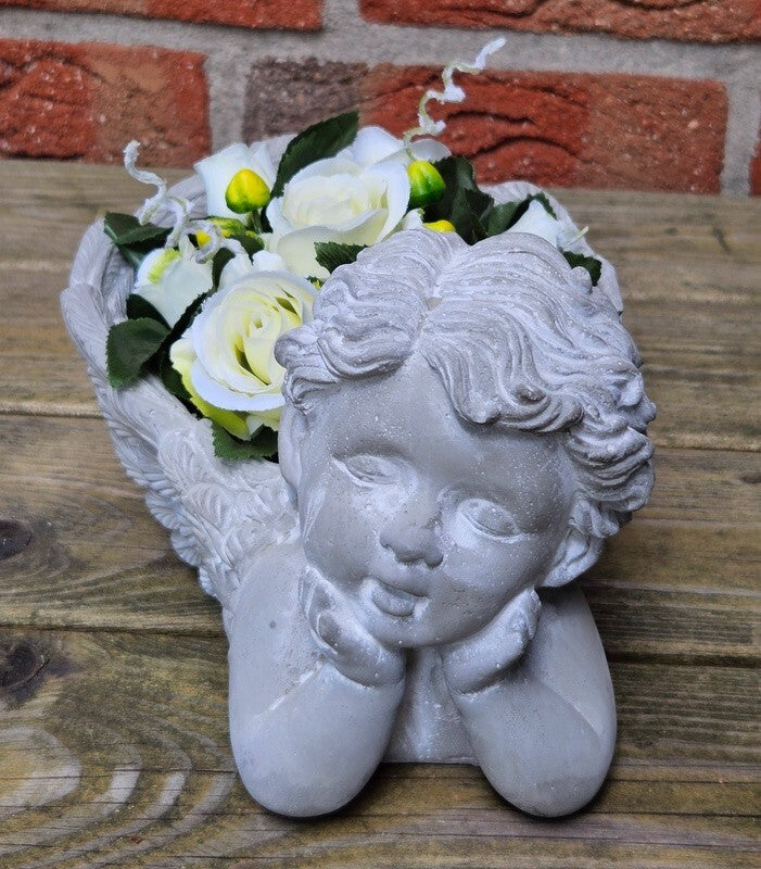 Ein bezauberndes Blumengesteck mit natürlich aussehenden, künstlichen Rosen dekoriert in einer grauen Betonschale als Engelfigur Da das...