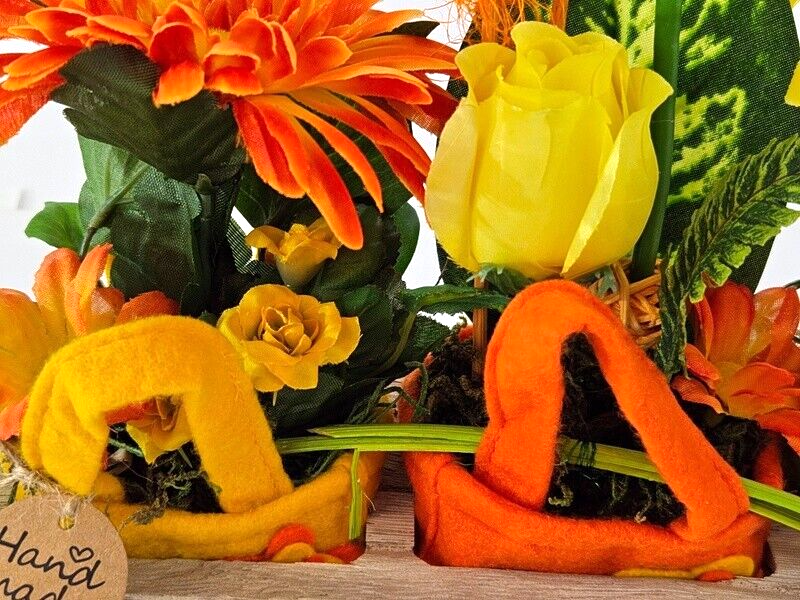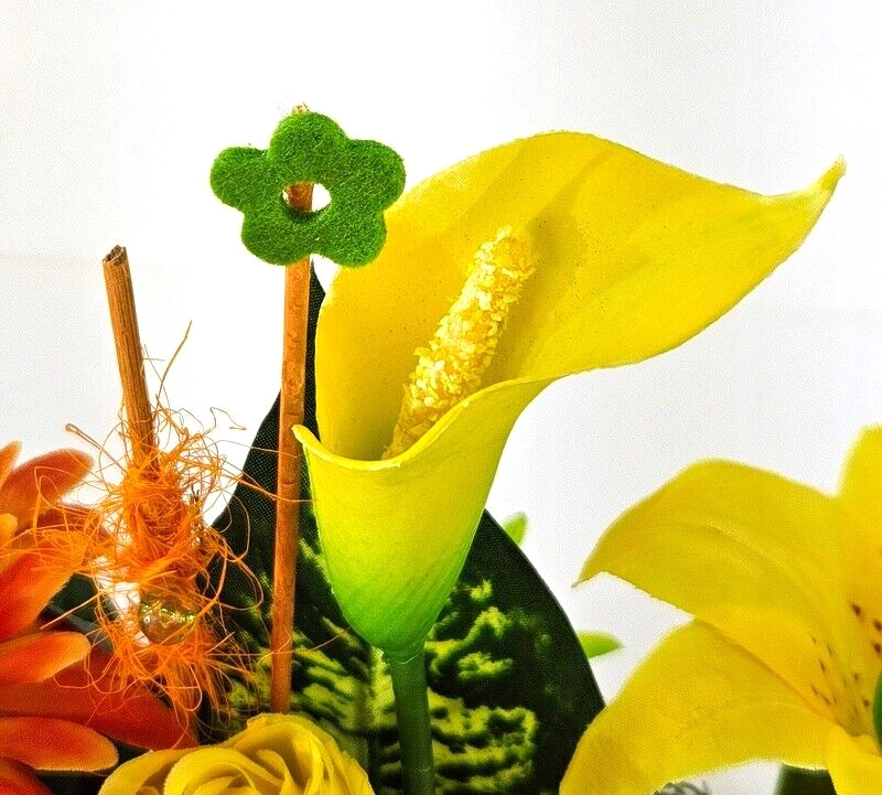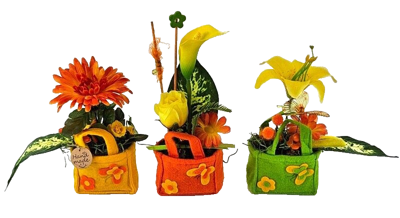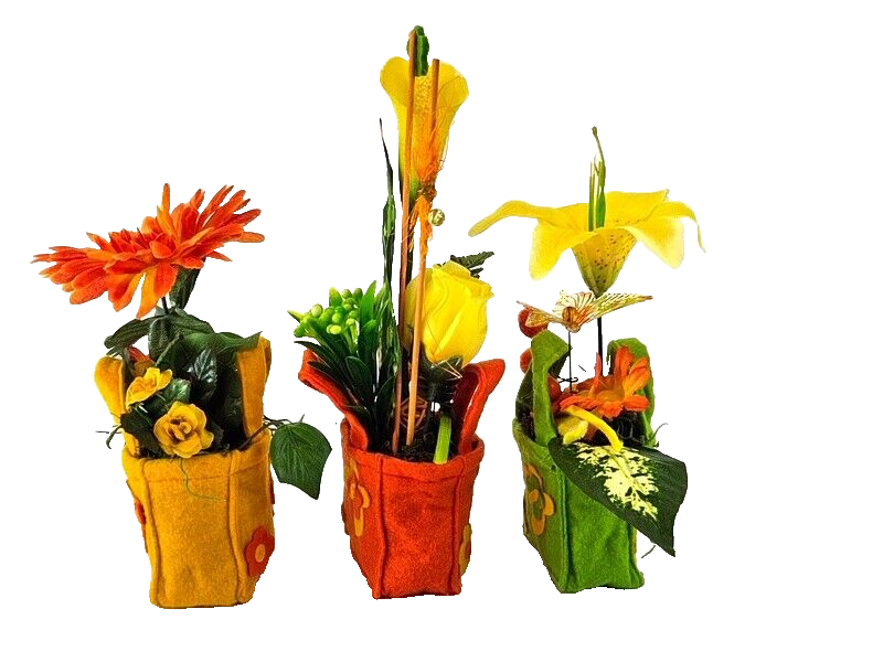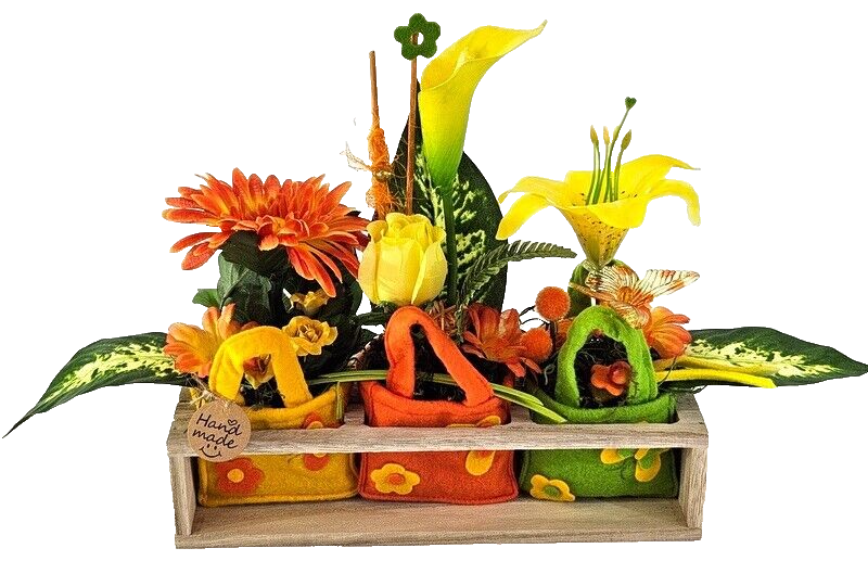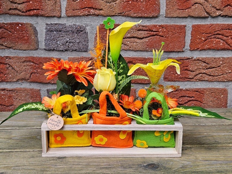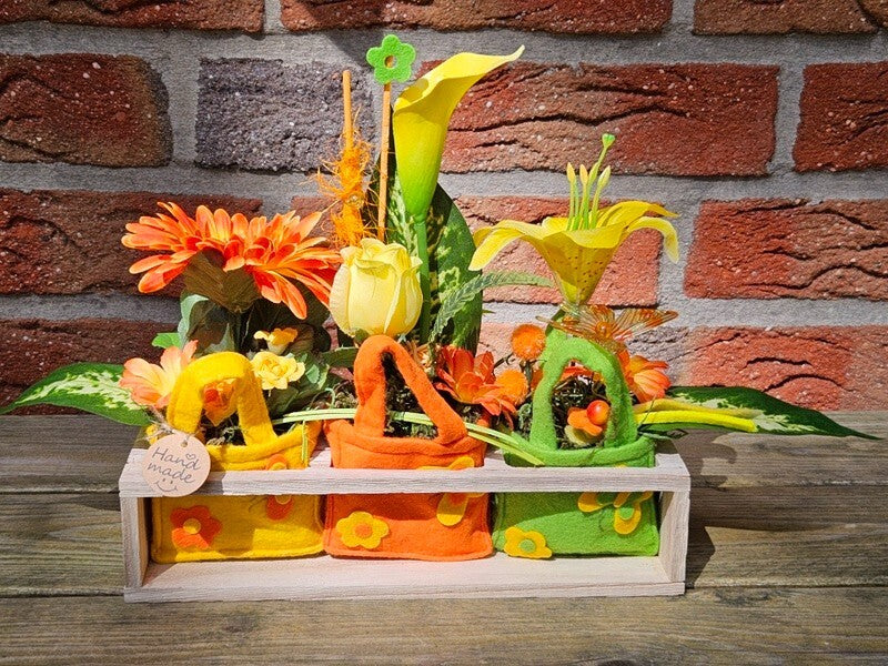 Gestecke 3 Stück in Holzbox Gelb Grün Orange Kunstblumen Filztaschen Dekoration