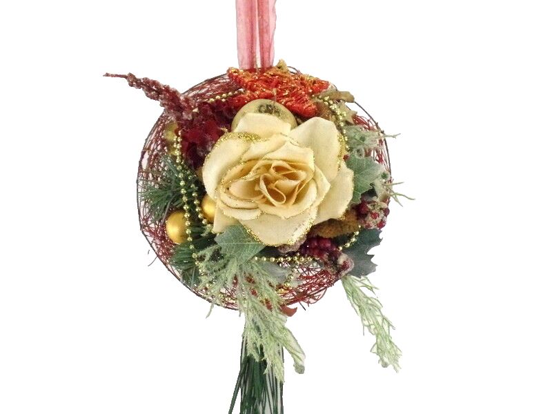 Material: künstliche Tanne, Seidenblumen, Kugeln,